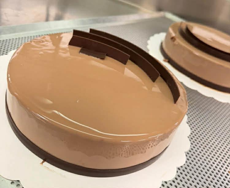 Le Majorque : Biscuit chocolat, confit exotique, croustillant noisette, crémeux et mousse au chocolat, glaçage au chocolat au lait.